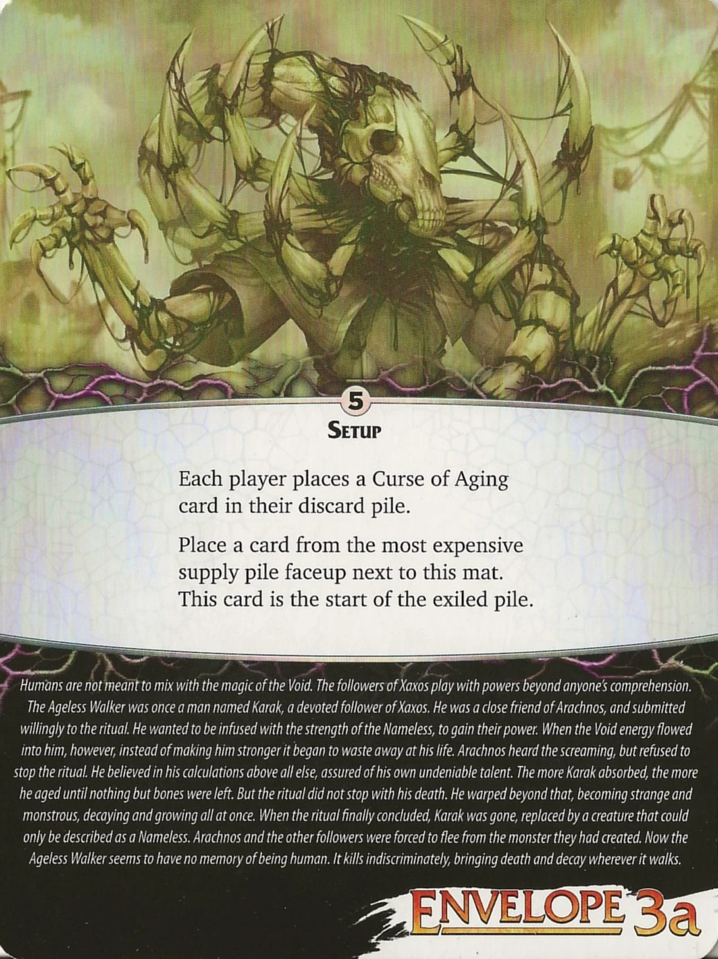 . Ageless Walker also causes the players' mages to age/decay rapidly, which is represented by a special Curse of Aging card that is added to each player's deck, causing damage when it is drawn.