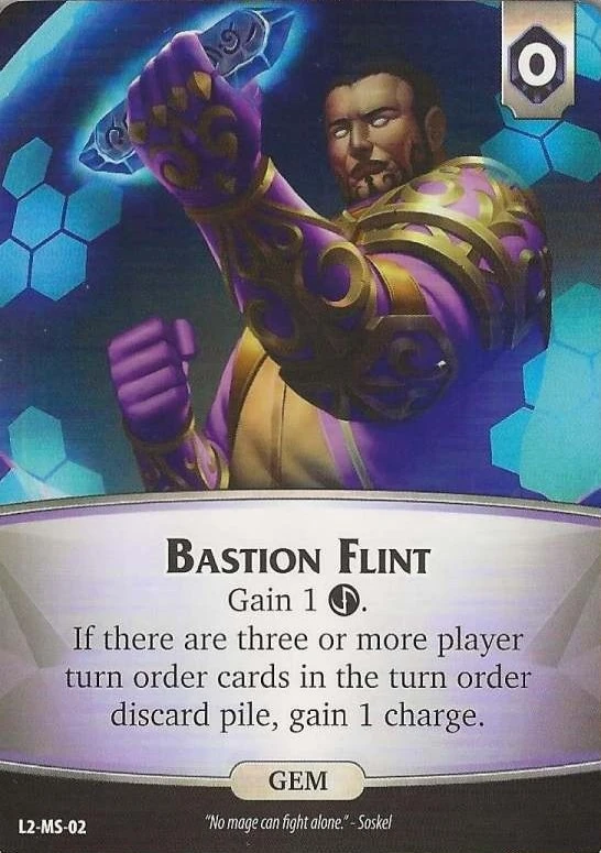 Bastion Flint is a gem from Legacy of Gravehold. Bastion Flint is a starter card for Soskel (Legacy of Gravehold) and so cannot be gained from the supply.