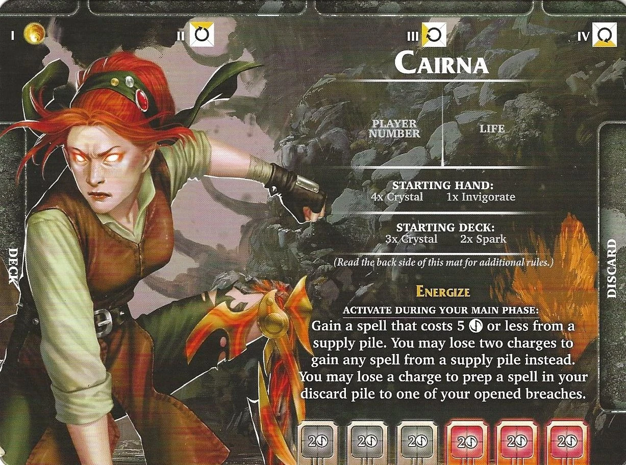 , which allows her to retrieve discarded spells for reuse. Cairna's special ability is very unique; at minimum it costs only 3 charges, however may cost up to 6 charges to be most powerful. At 6 charges, Cairna may gain any spell from a supply pile, prepping it directly to a breach. With the right supply this ability can be extremely powerful.