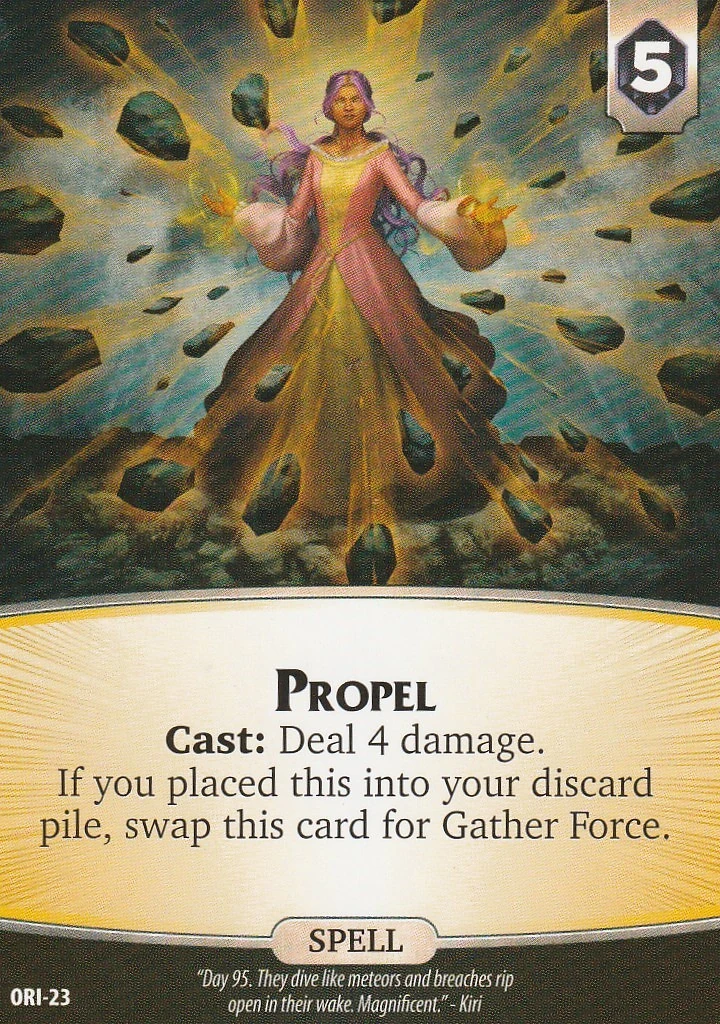 Gather Force is a relic card from the Origins expansion. Gather Force starts in the Swap zone if Propel