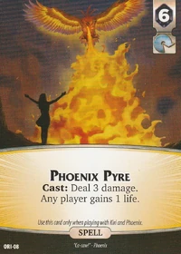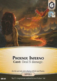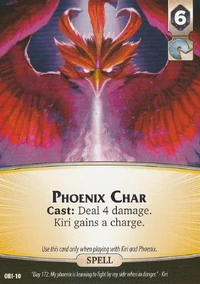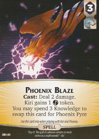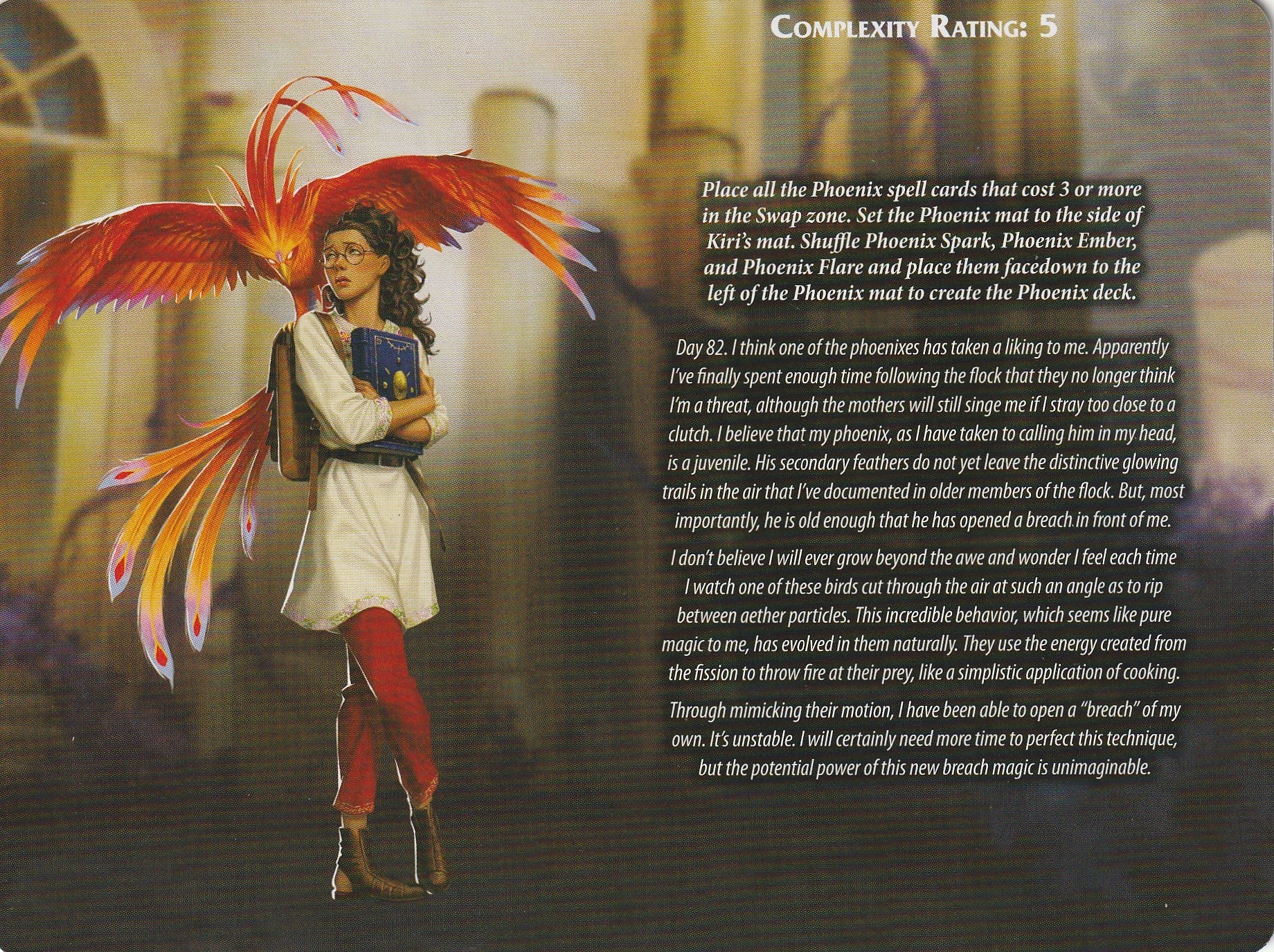 She has a pet Phoenix, which acts as a sort of proto-mage sidekick having his own mat, his own breach and his own deck and discard piles. The Phoenix is not considered an ally or a player for any purpose. At the end of Kiri's draw phase, the draw a card from its Phoenix deck and preps that spell on his breach. During Kiri's casting phase, that spell must be cast and then subsequently discarded to the Phoenix discard pile. The Phoenix spells can be upgraded using the Swap mechanic using Knowledge