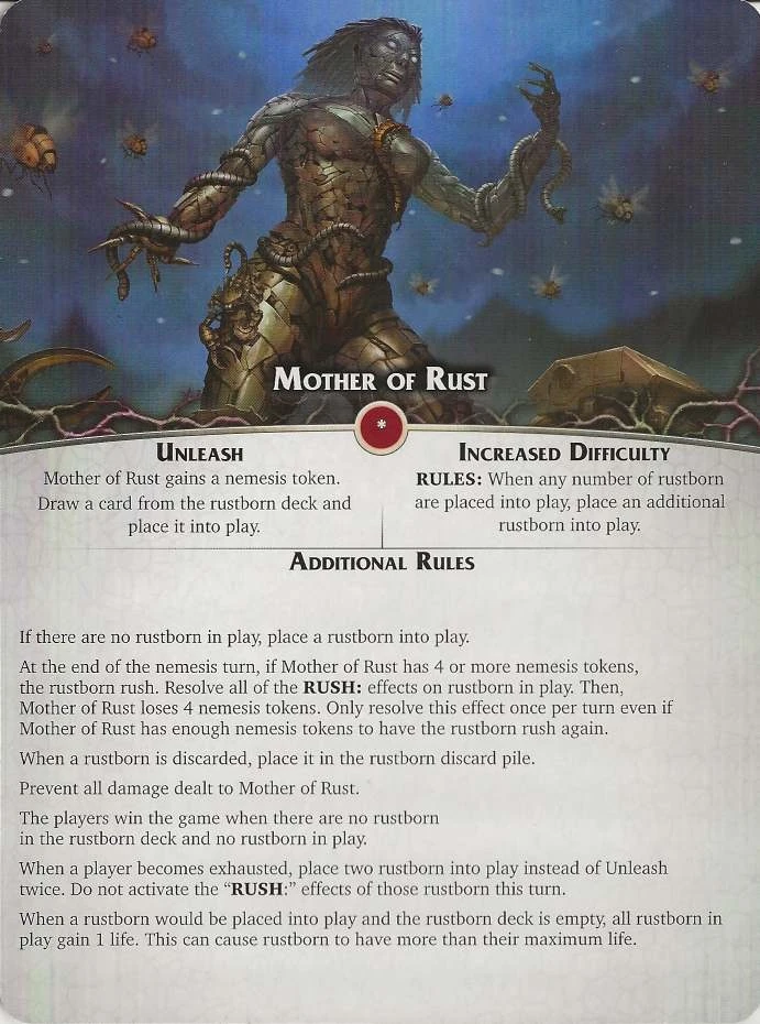 At the end of the nemesis turn, if Mother of Rust has 4 or more nemesis tokens, the rustborn rush. Resolve all of the RUSH: effects on rustborn in play. Then, Mother of Rust loses 4 nemesis tokens. Only resolve this effect once per turn even if Mother of Rust has enough nemesis tokens to have the rustborn rush again.