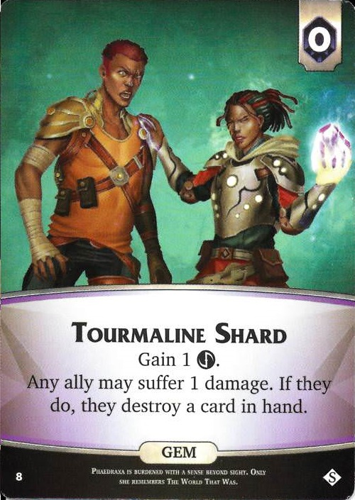 Tourmaline Shard is a gem from the Core set. Tourmaline Shard is a starter card for Phaedraxa, and so cannot be gained from the supply.